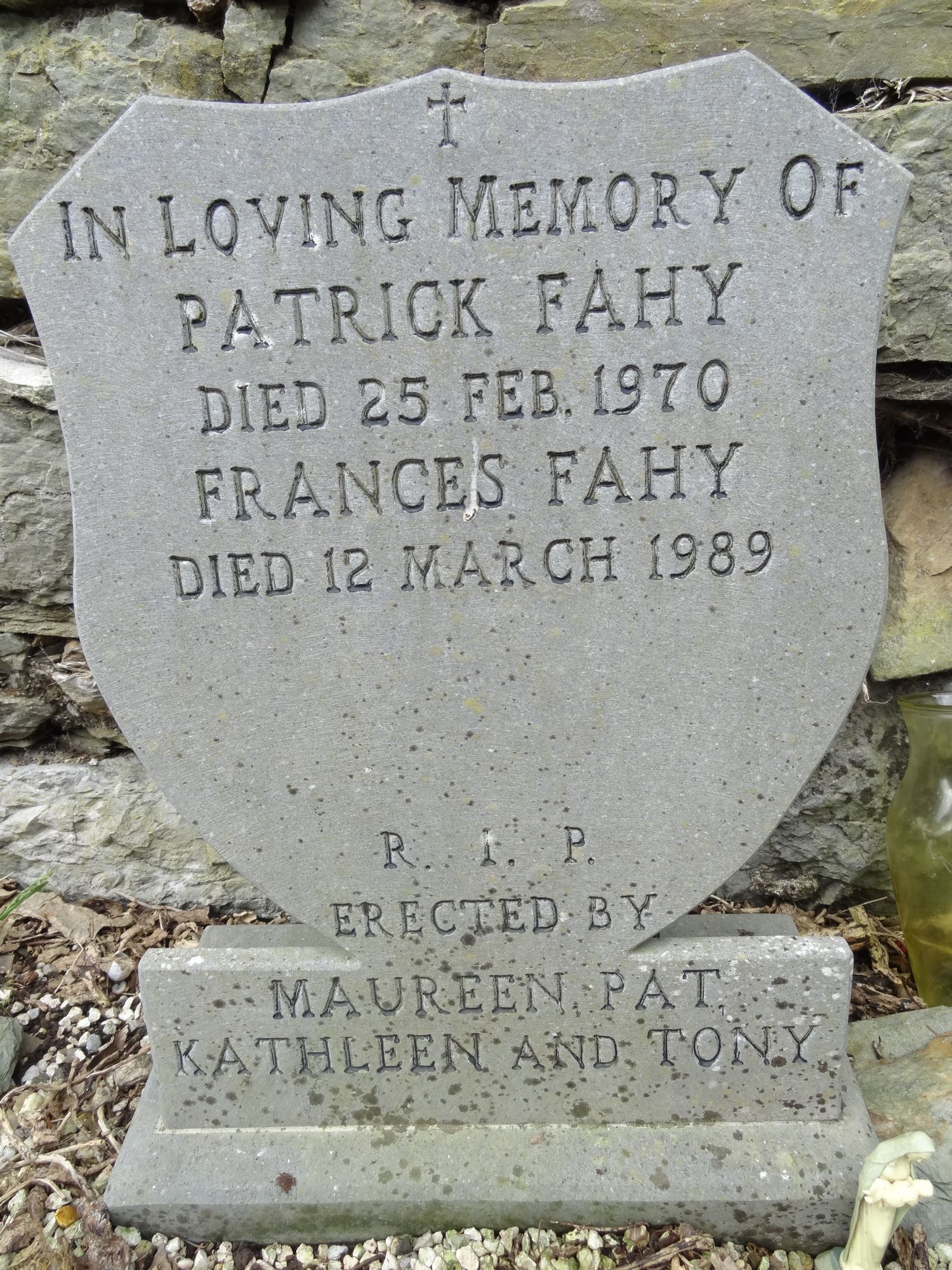 +In loving memory ofPatrick Fahydied 25 Feb. 1970Frances Fahydied 12 March 1989R.I.P.Erected byMaureen, Pat,Kathleen and Tony