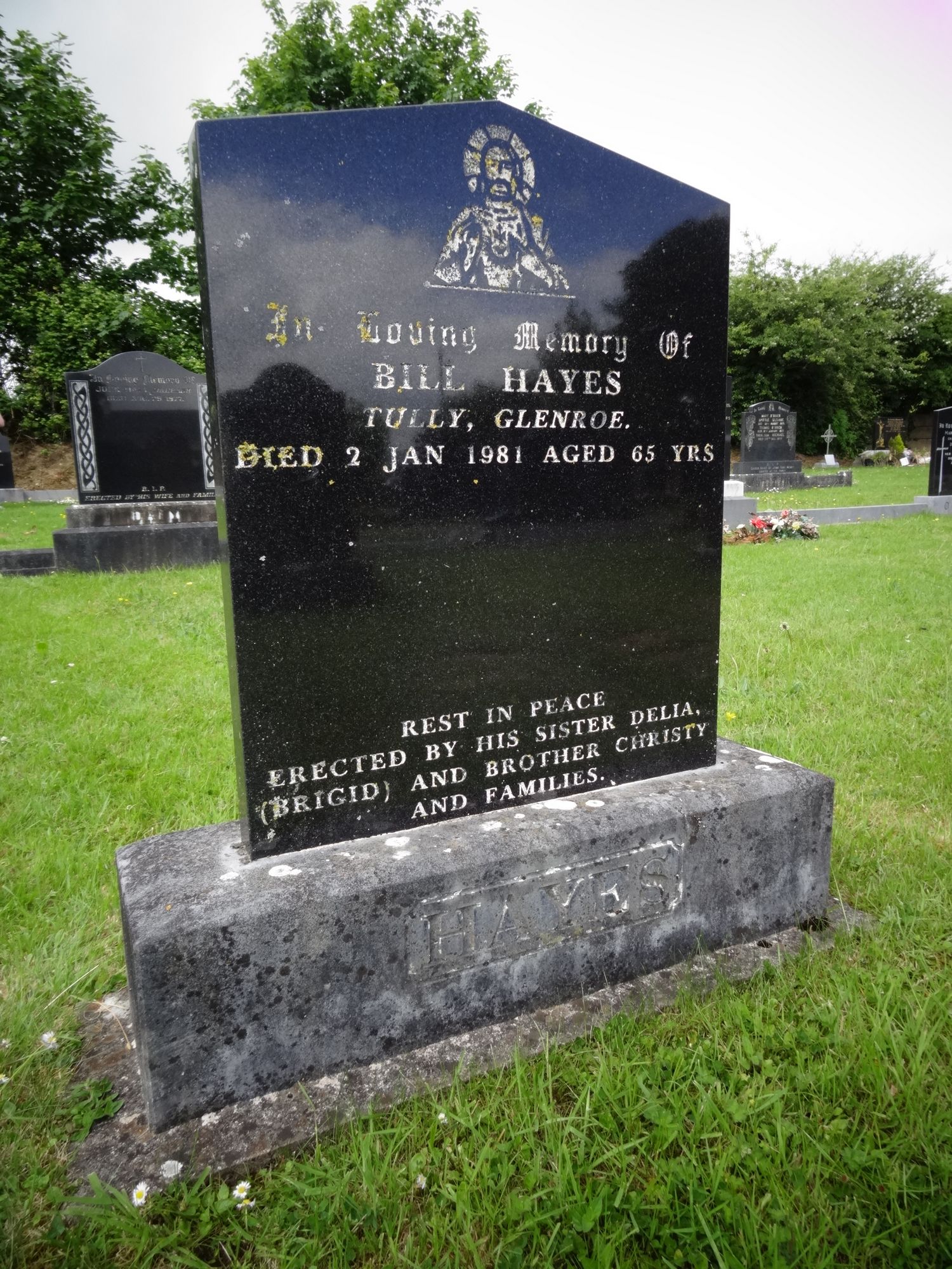 In loving memory of Bill Hayes Tully Glenroe Died 2 Jan 1981 aged 65 yrs Rest in Peace Erected by his sister Delia (Brigid) and brother Christy And families