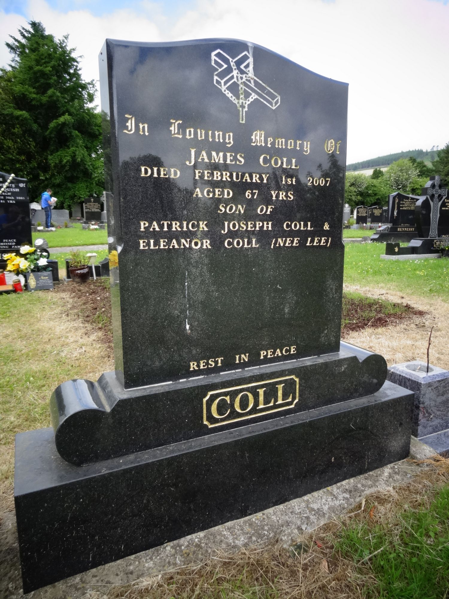 In loving memory of James Colldied February 1st 2007aged 67 yrsson of Patrick Joseph Coll &Eleanor Coll (nee Lee)Rest in Peace