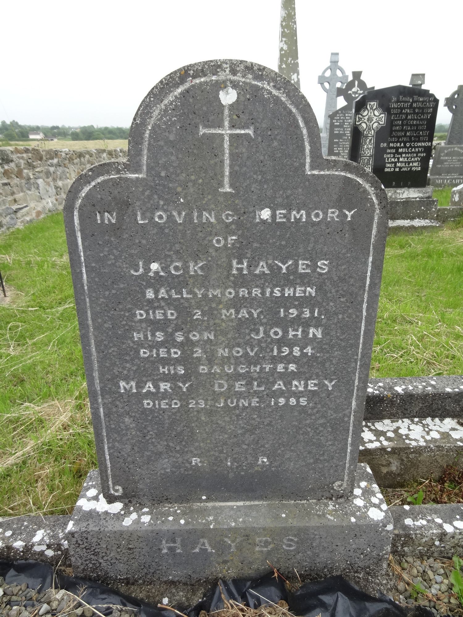 In Loving MemoryOfJACK HAYESBallymorrishenDied 2. May. 1931. His Son JOHNDied 2. Nov. 1984.His DaughterMARY DELANEYDied 23. June. 1985.