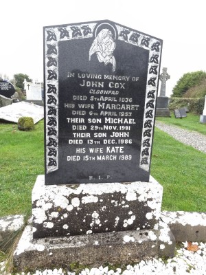 IN LOVING MEMORY OF JOHN COX CLOONFAD DIED 5TH APRIL 1936 HIS WIFE MARGARET DIED 6TH APRIL 1953 THEIR SON MICHAEL DIED 29TH NOV. 1981 THEIR SON JOHN DIED 13TH DEC. 1986 HIS WIFE KATE DIED 15TH MARCH 1989 R.I.P.