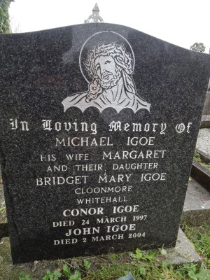 In Loving Memory of MICHAEL IGOE His wife MARGARET AND THEIR DAUGHTER BRIDGET MARY IGOE CLOOMORE WHITEHALL CONOR IGOE DIED 24 MARCH 1997 R.I.P.