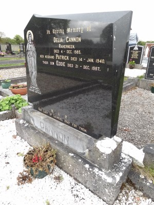 In loving memory of Delia Cannon, Raherneen, died 4 Dec. 1985.And husband Patrick, died 14 Jan. 1940.Their son Eddie, died 21 Dec. 1987.