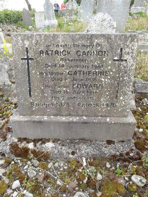 In loving memory of Patrick Cannon, Raherneen, died 14 January 1940His mother Catherine, died 4 June 1936His father Edward, died 16 April 1916His grandparents Bridget 1875 & Patrick 1870