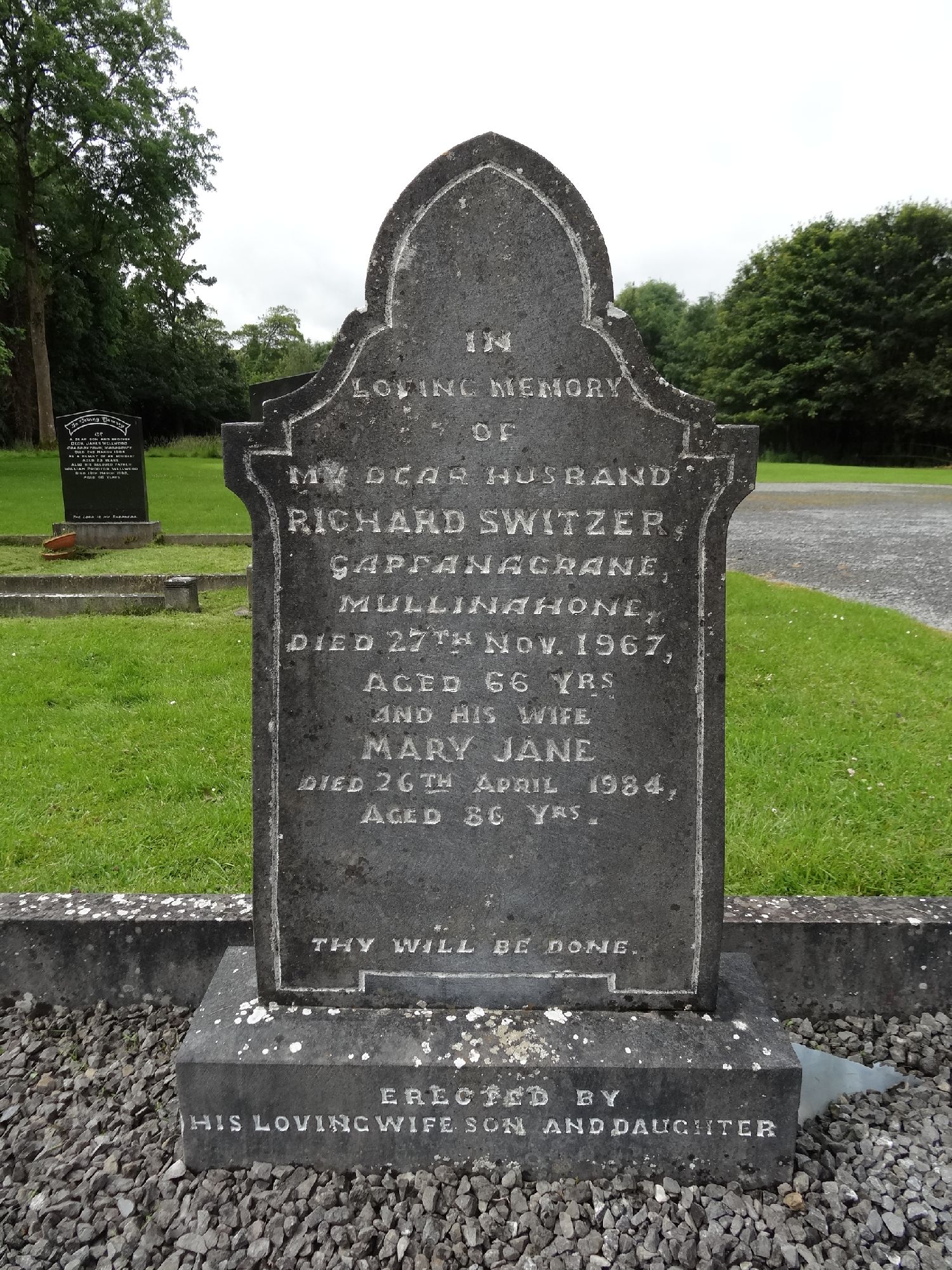 In loving memory of My dear husband RICHARD SWITZER, Cappanagrane, Mullinhone, Died 27th Nov. 1967 Aged 66 Yrs And his wife MARY JANE Died 26th April 1984 Aged 86 Yrs