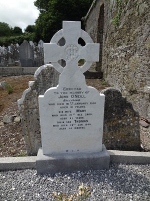 Erectedto the memory ofJohn O'NeillBallydavidwho died 18th January 1951aged 51 yearshis Wife Marywho died 21st Dec 2000aged 91 yearstheir Son Thomaswho died 26th Jan 1949aged 14 months