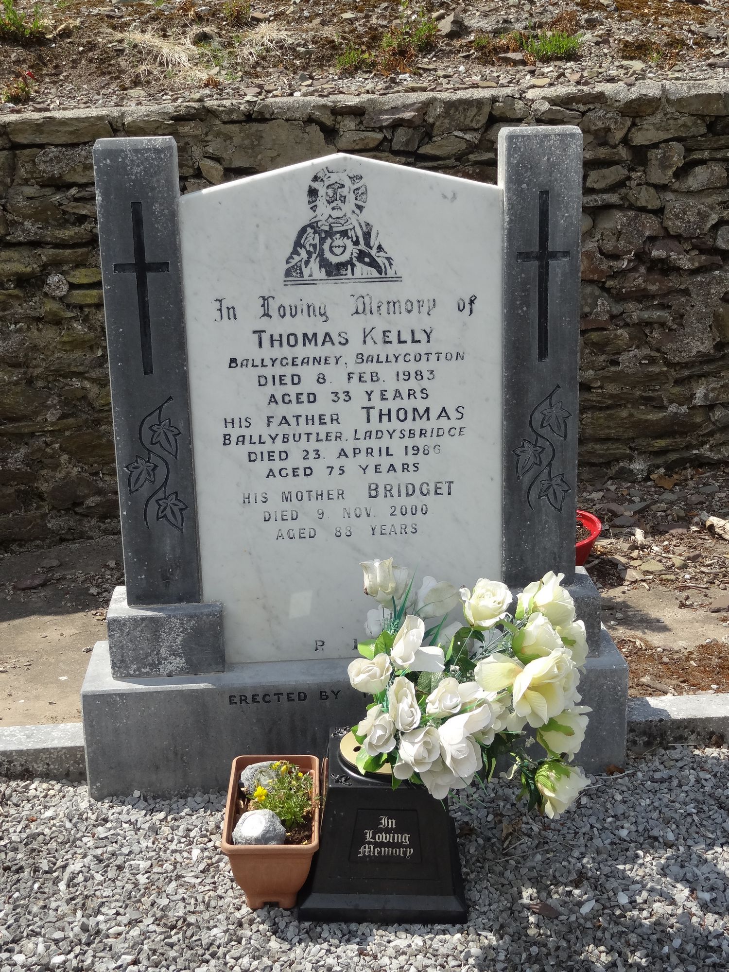 In loving memory ofThomas KellyBallygeaney Ballycottondied 8th Feb 1983aged 33 yearshis Father ThomasBallybutler Ladysbridgedied 23 April 1986aged 75 yearshis Mother Bridgetdied 9 Nov 2000aged 88 yearsR.I.P.Erected by Thomas Kelly