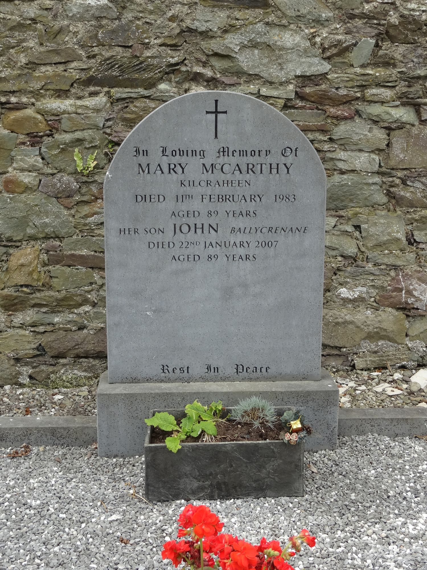 +In loving memory ofMary McCarthyKilcraheendied 11th February 1983aged 89 yearsher Son John Ballycrenanedied 22nd January 2007aged 89 yearsRest in Peace