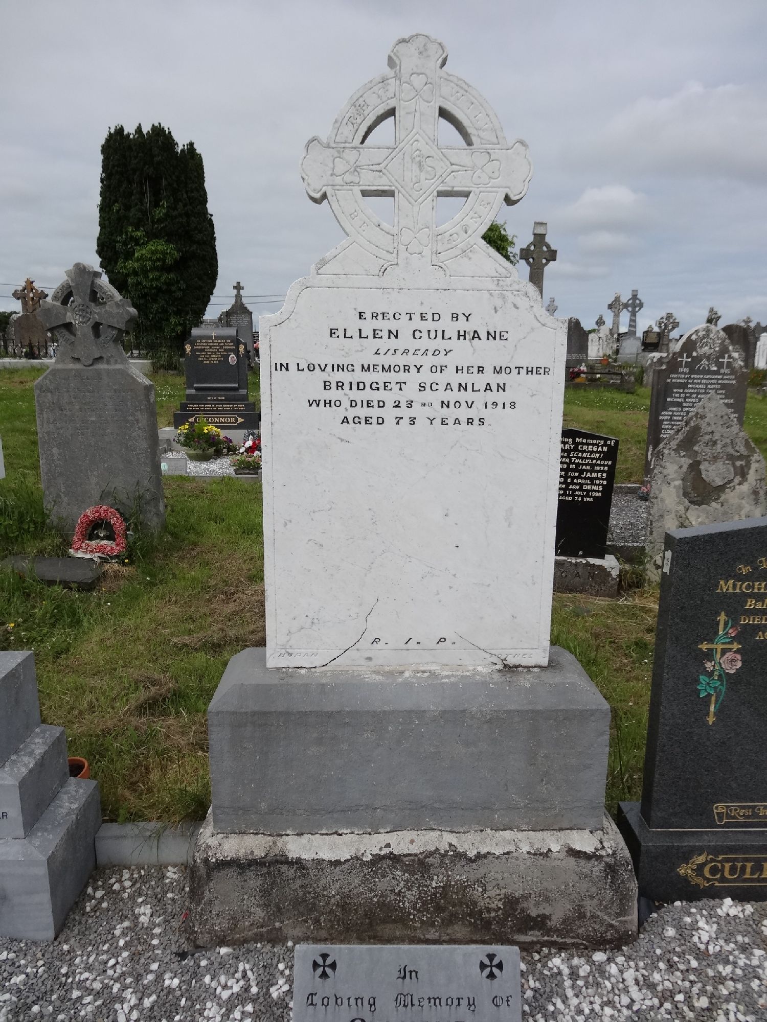 Erected ByEllen CulhaneLisreadyIn Loving Memory Of Her MotherBridget ScanlanWho Died 23rd Nov 1918Aged 73 Years