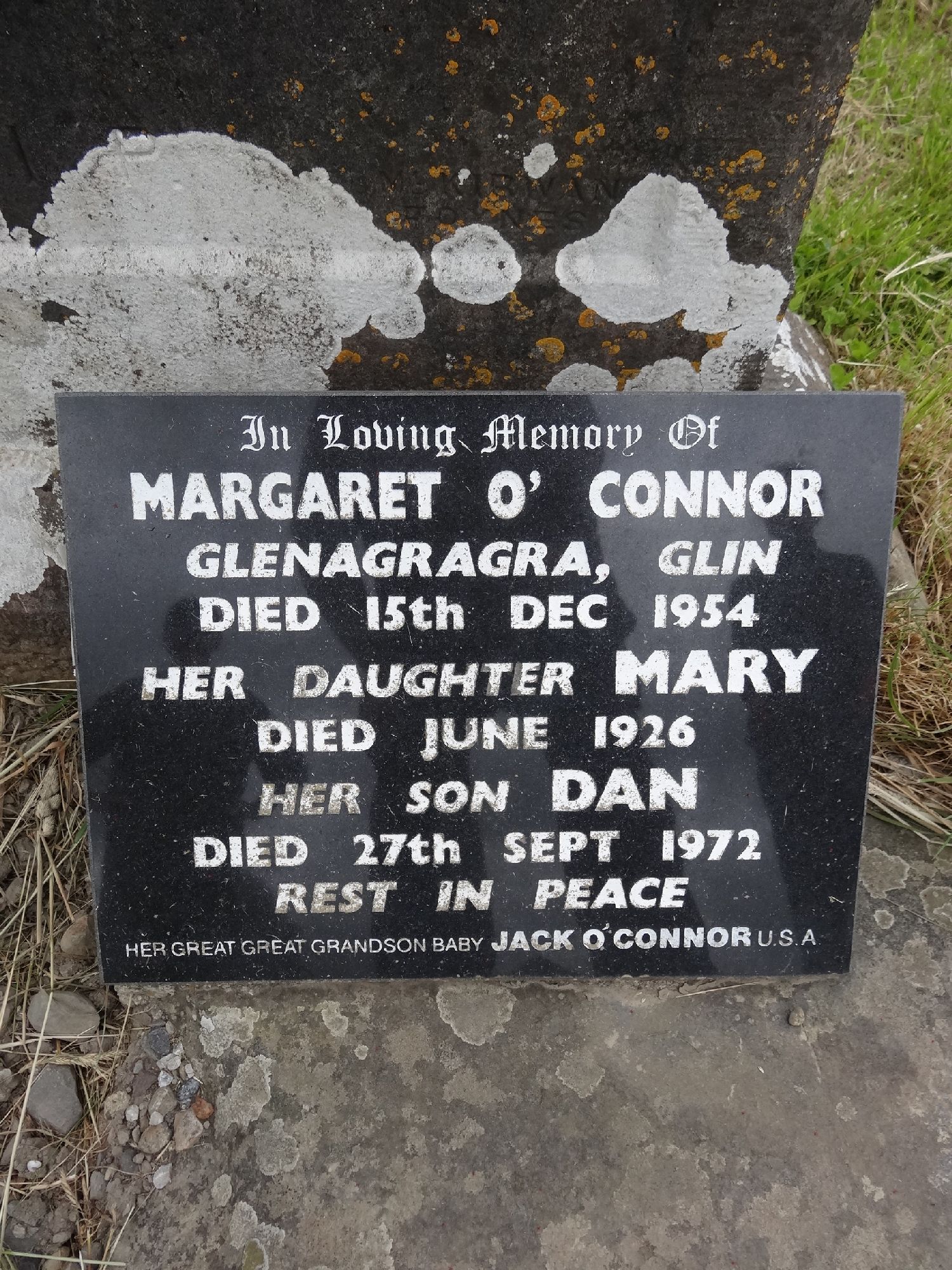 In Loving Memory OfMARGARET O'CONNORGlenagragra, GlinDied 15th Dec 1954Her Daughter MARYDied June 1926Her Son DAN Died 27th Sept 1972
