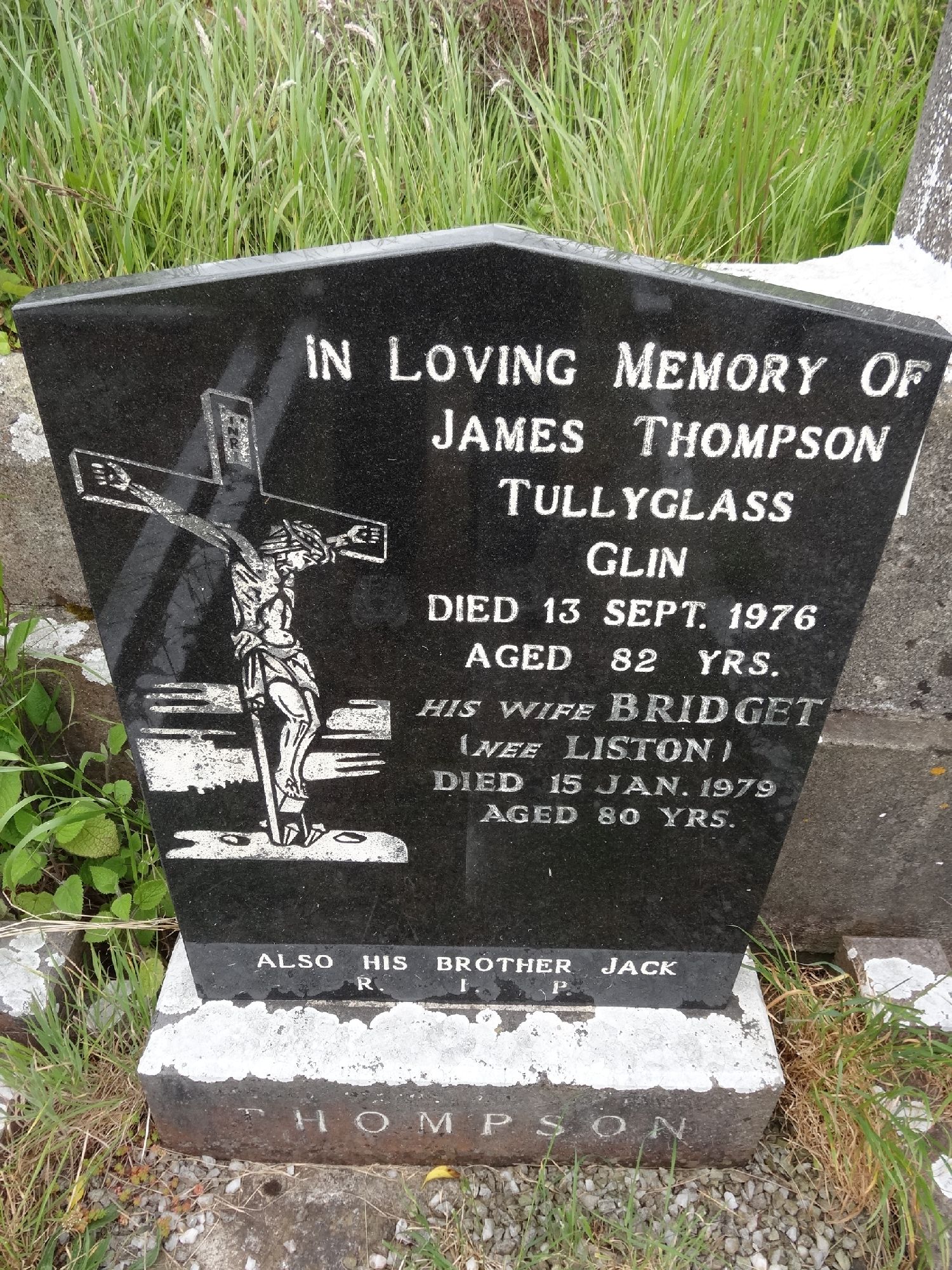 In Loving Memory OfJAMES THOMPSONTullyglassGlinDied 13 Sept. 1976Aged 82 Yrs.His Wife BRIDGET(Nee LISTON)Died 15 Jan. 1979Aged 80 Yrs.