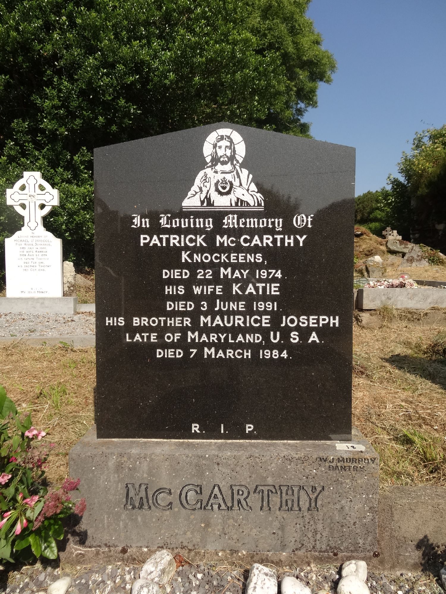 In loving memory of Patrick McCarthyKnockeensdied 22 May 1974his wife Katiedied 3 June 1991His brother Maurice Josephlate of Maryland U.S.A.died 7 March 1984RIP