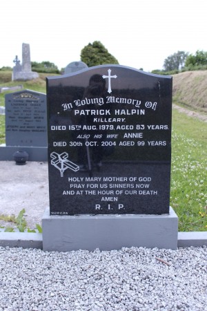 In loving memory of Patrick Helpin, Killeary, died 15th Aug. 1979, aged 83 years.Also his wife Annie, died 30th Oct. 2004, aged 99 years.