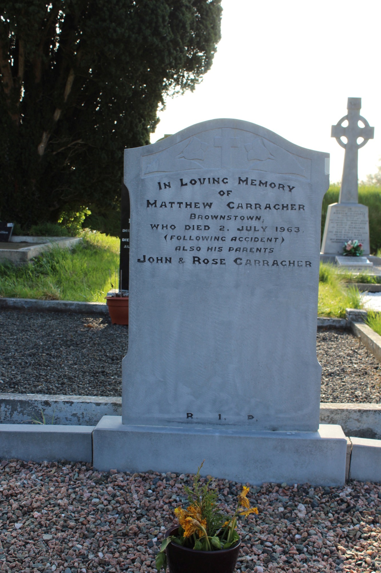 In loving memory of Matthew Carracher, Brownstown, who died 2. July 1963 (following accident).Also his parents John & Rose CarracherĀ