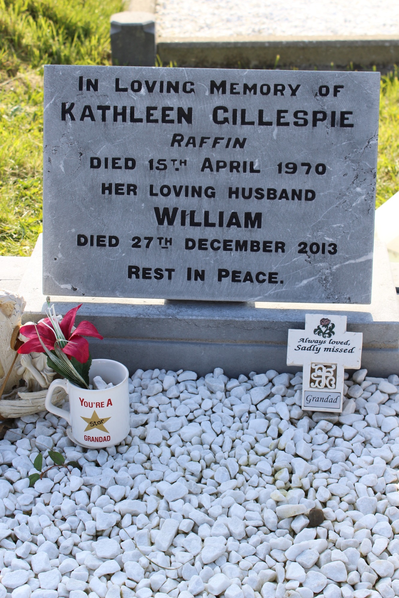 In loving memory of Kathleen Gillespie, Raffin, died 15th April 1970.Her loving husband William, died 27th December 2013.