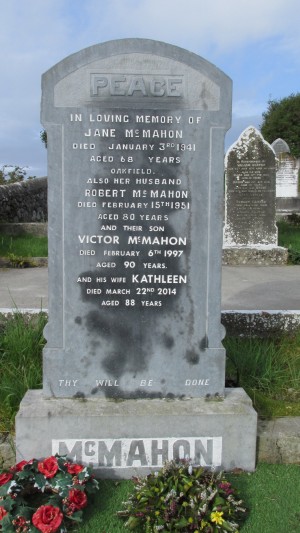 PEACE/ In Loving Memory of / Jane McMahon/ Died January 3rd 1941/ Oakfield./Also her husband / Robert McMahon/ Died February 15th 1951/ Aged 80 years/ And their son/ Victor McMahon/ Died February 6th 1997/ Aged 90 years/ And his wife Kathleen/ Died March 22nd 2014/ Aged 88 years/ Thy Will be Done/ MCMAHON