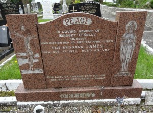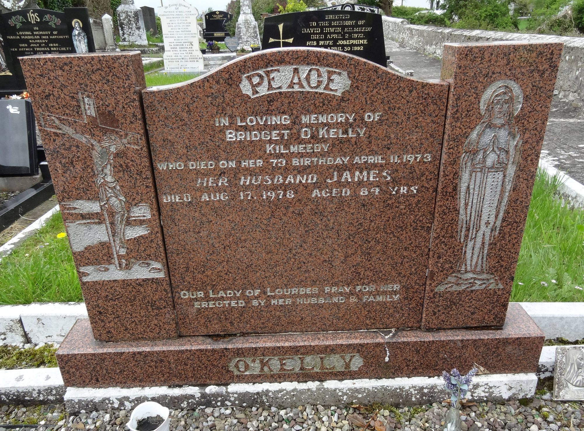 In Loving Memory OfBRIDGET O'KELLYKilmeedyWho Died On Her 73 Birthday April 11, 1973Her Husband JAMESDied Aug 17. 1978 Aged 84 Yrs