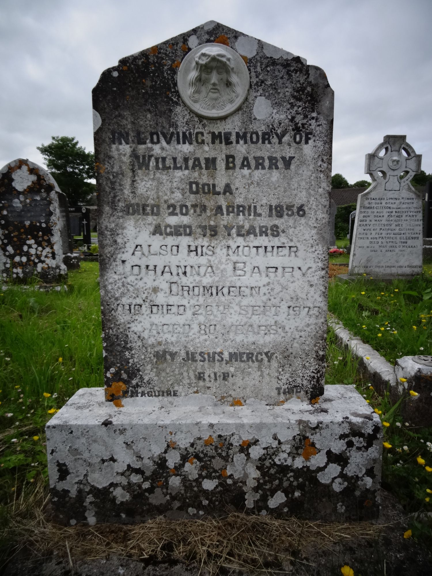 In loving memory of William BarryOoladied 20th April 1956aged 75 years also his mother Johanna BarryDromkeenwho died 26th Sept 1973aged 80 yearsMy Jesus Mercy RIP