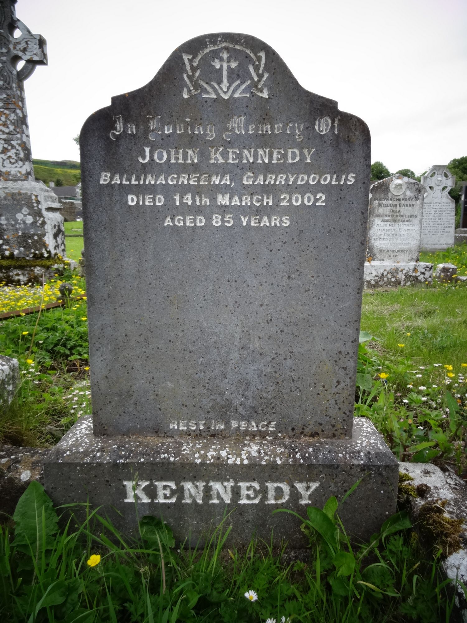 In loving memory of John KennedyBallinagreena, Garrydoolisdied 14th March 2002aged 85 yearsrest in peaceKennedy