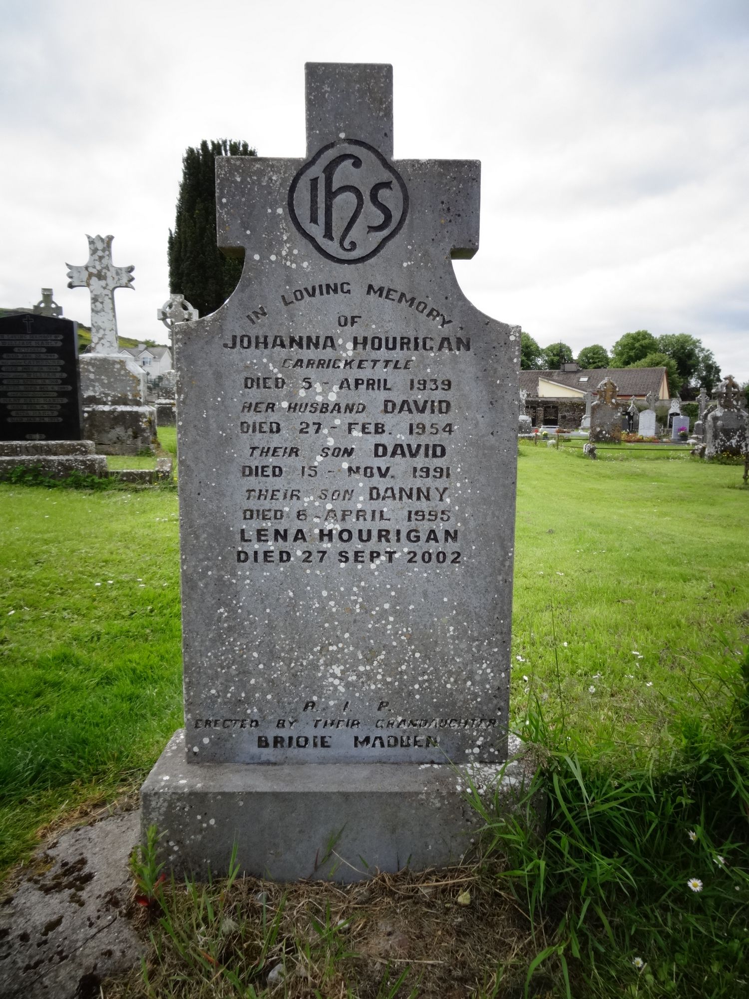 IHSIn loving memoryOfJohanna HouriganCarrickettledied 5th April 1939her husband Daviddied 27 Feb 1954Their son Dannydied 6 April 1995Lena Hourigan died 27 Sept 2002RIP Erected by their grandaughterBridie Madden