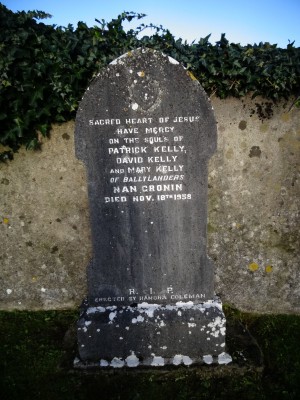 Sacred heart of Jesushave mercyon the souls of Patrick KellyDavid KellyMary Kelly of BallylandersNan Cronindied Nov 18th 1958RIPerected by Hanora Coleman