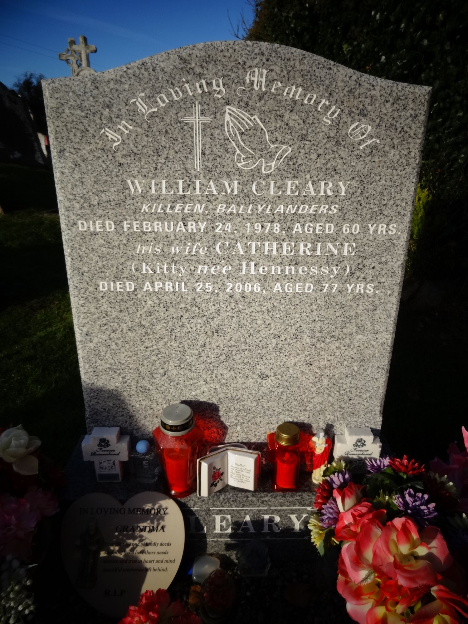 In loving memory of William ClearyKilleeen Ballylandersdied February 24 1978 age 60his wife Catherine (Kitty nee Hennessy)died April 25 2006 age 77
