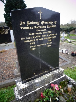 In loving memory of Thomas Patrick CusackCullanedied April 19th 1936his wife Ellen (nee O' Donnell)interred in The Hill Knocklongdied 1916their daughter Marydied 1926RIPerected by The English Family Cullane Middle