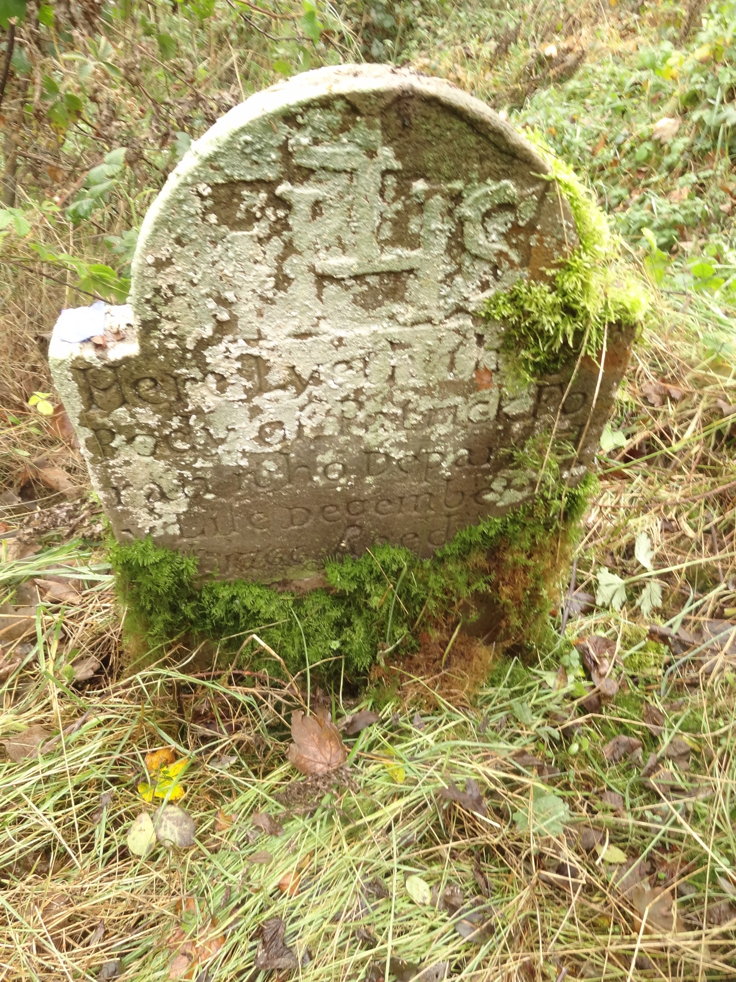 Round topped headstone with flat shoulders. Sound and in situ, pink sandstone.