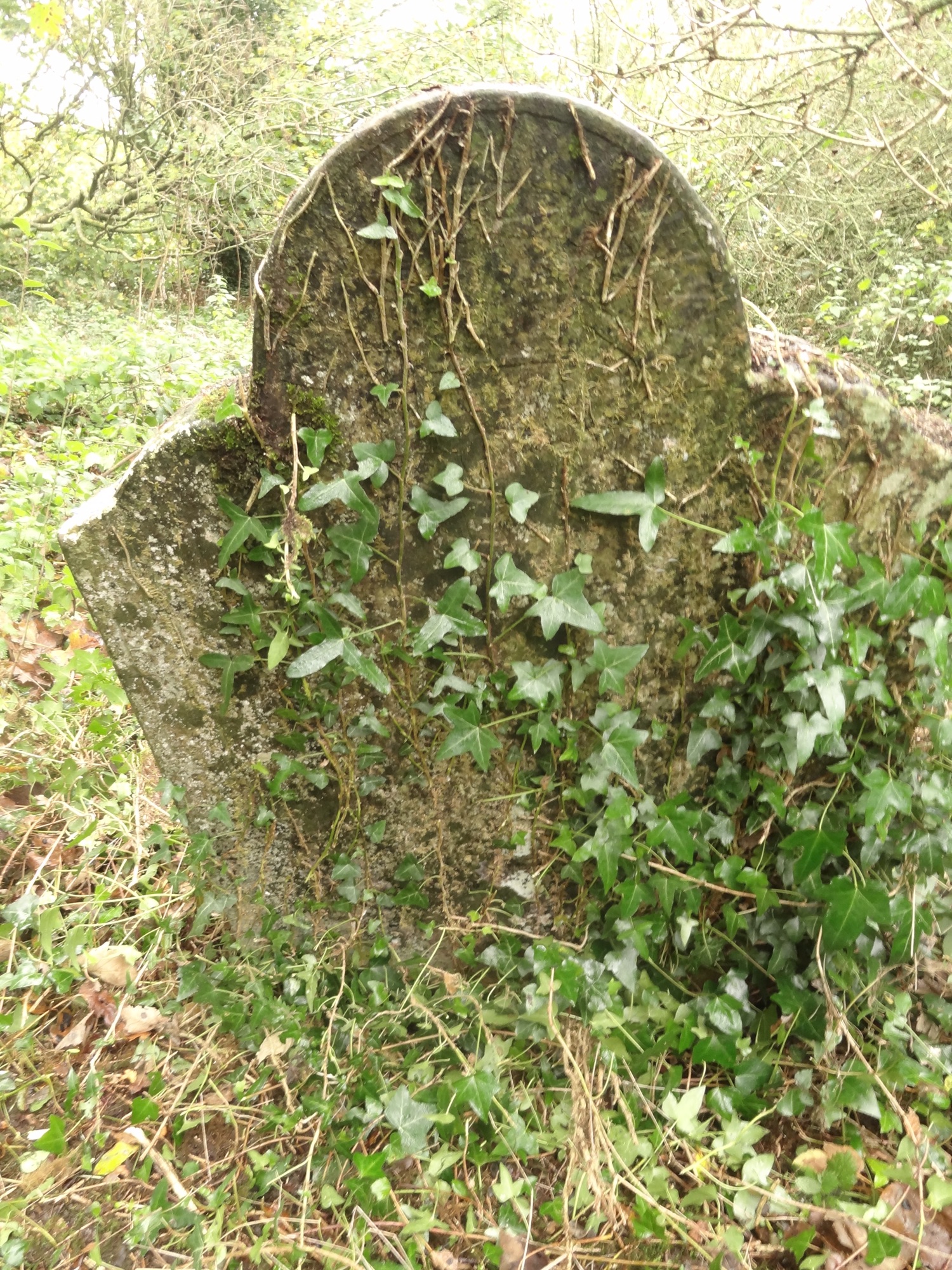 Round topped headstone with angles and convex shoulders. Sound and in situ. IHS with cross attached in sunburst. Upright heart below H and 2 ciboria or hourglasses?