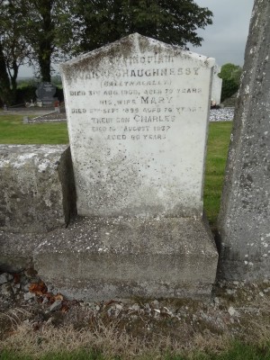 In MemoriamJOHN O' SHAUGHNESSY(Ballynacally,)Died 31ST Aug. 1990, Aged 79 Years.His Wife MARYDied 5TH Sept 1895 Aged 76 Years.Their Son CHARLESDied 16TH August 1937Aged 86 Years