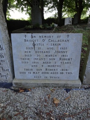 In Memory of Bridget O Callaghan Castle - Erkin died 21 Aug 1925 her husband Johnny died 30 March 1951 their infant son Robert died 1914 aged 2 years and 9 months their son Robeert (Bob) died 15 May 2006 aged 88 yrs