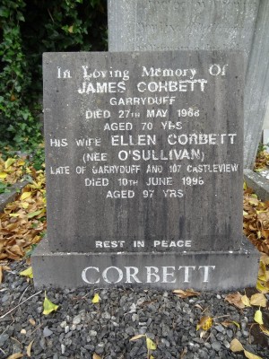 In Loving Memory OfJAMES CORBETTGarryduffDied 27TH May 1968Aged 70 YrsHis Wife ELLEN CORBETT(NEE O'SULLIVAN)Late Of Garryduff And 107 CastleviewDied 10TH June 1996Aged 97 Yrs