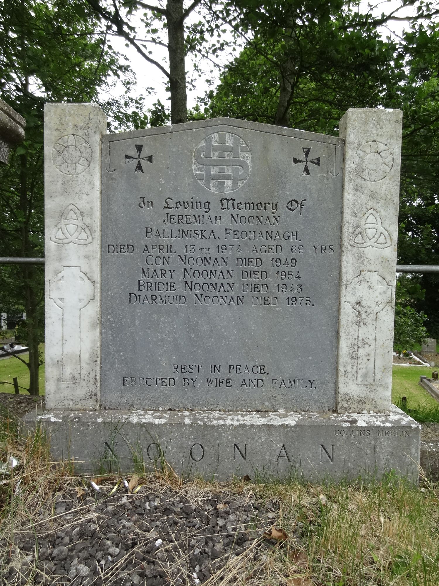 In Loving Memory OfJEREMIAH NOONANBALLINISKA, FEOHANAGH.DIED APRIL 13TH 1974 AGED 69 YRSCON NOONAN DIED 1949MARY NOONAN DIED 1954BRIDIE NOONAN DIED 1943DIARMUID NOONAN DIED 1975.