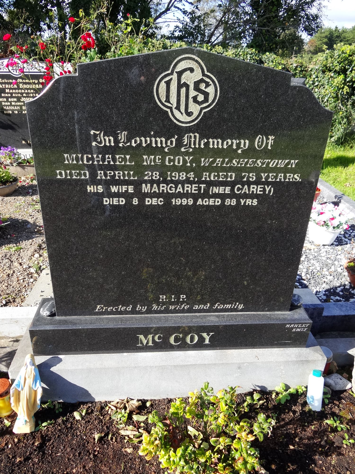 In Loving Memory OfMICHAEL MCCOY, WalshestownDied April 28, 1984, Aged 75 YearsHis Wife MARGARET (NEE CAREY)Died 8 Dec 1999 Aged 88 Yrs