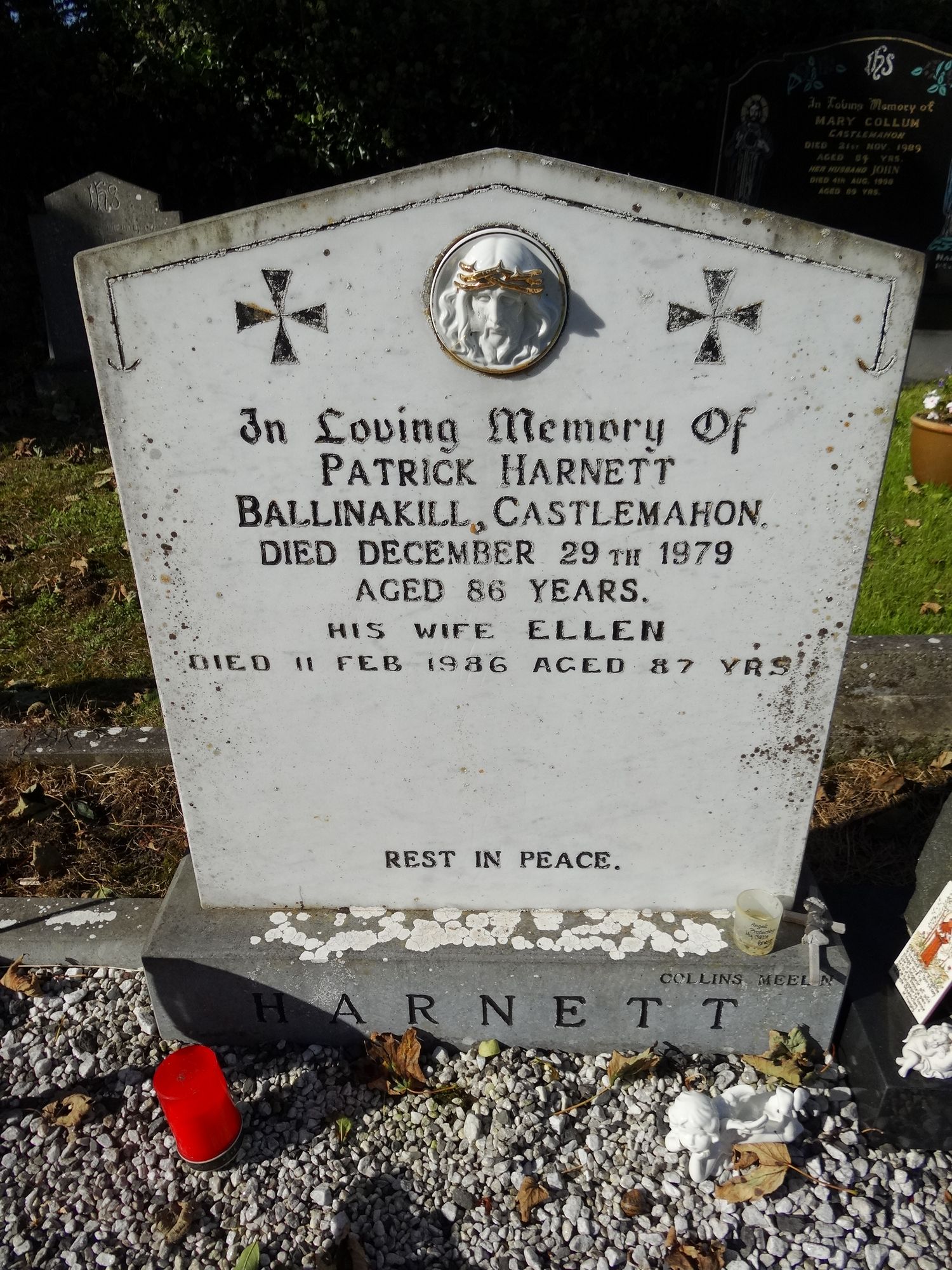 In Loving Memory OfPATRICK HARNETTBallinakill, CastlemahonDied December 29TH 1979Aged 86 Years.His Wife ELLENDied 11 Feb 1986 Aged 87 Yrs