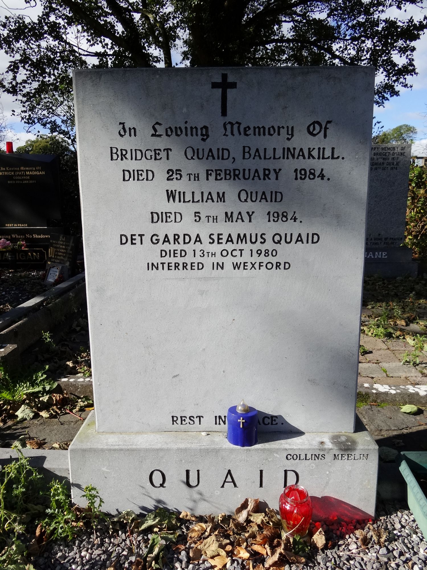 In Loving Memory OfBRIDGET QUAID, BALLINAKILL.DIED 25TH FEBRUARY 1984.WILLIAM QUAIDDIED 5TH MAY 1984.DET GARDA SEAMUS QUAIDDied 13TH Oct 1980Interred In Wexford