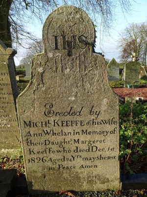 IHS Erected by MICH,L KEEFFE & his Wife Ann Whelan in Memory of their Daughr, Margaret Keeffe who died Dec,r 1st 1826 Aged 24 Yrs may She rest in Peace Amen.
