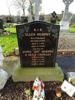 R.I.P. ELLEN MURPHY BALLINDANGAN MITCHELSTOWN DIED 5.7.1974 AGED 63 YEARS ALSO HER SON JAMES 'JIM' MURPHY O'NEILL CROWLEY MITCHELSTOWN DIED 17.12.1998 AGED 60 YEARS REST IN PEACE