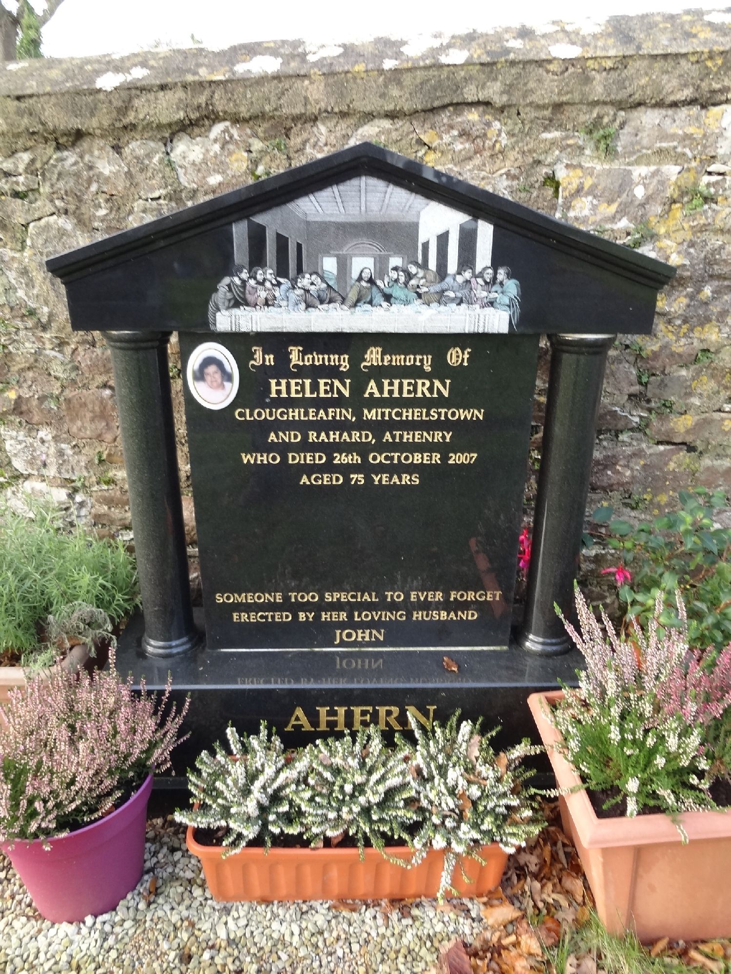 In Loving Memory Of HELEN AHERN CLOUGHLEAFIN, MITCHELSTOWN AND RAHARD,ATHENRY WHO DIED 26th OCTOBER 2007 AGED 75 YEARS SOMEONE TOO SPECIAL TO EVER FORGET ERECTED BY HER LOVING HUSBAND JOHN AHERN