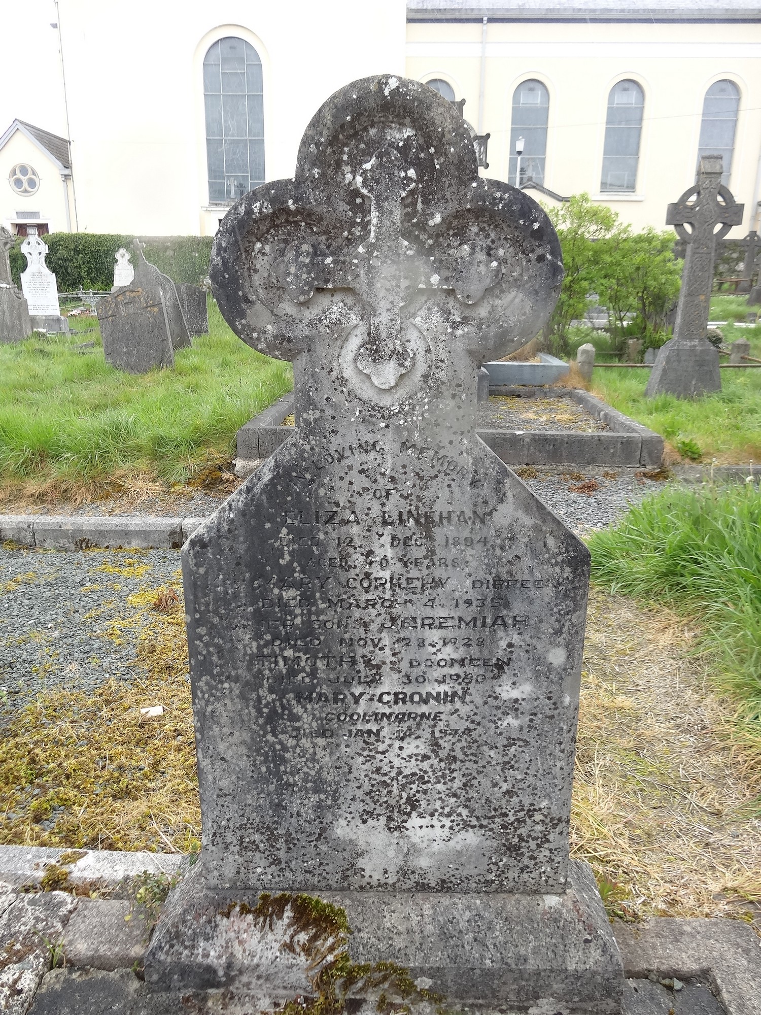 In Loving MemoryOfELIZA LINEHANDied 12 Dec 1894Aged 70 yearsMARY CORKERY, DIRREENDied March 4 1935Her sons JEREMIAH Died Nov 28 1928TIMOTHY, DOONEENDied Jul 30 1960MARY CRONINCOOLINARNEDied Jan 14 1974