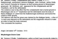 Mr. Terence O’Reilly, Corlattylannon and Patrick O’Reilly, R. D. C., Bailieborough, summoned Laurence Mulligan, John Greenan, James Reilly and Terence Donnelly for trespass on their burying ground in Moybologue graveyard. Mr. McBreen, solr., appeared for the complainants and Mr Chambers, solr for the defendants. The evidence was to the effect that the complainants had a burial ground in Moybologue and on 21st September last the defendants took the body of Nancy Mulligan or Lorish from the Bailieborough workhouse and buried the corpse in their ground. The defence was that the grave was claimed by the Mulligan family – a fine of 1s each was imposed on the defendants but the magistrate refused to make an order to have the body removed. This concluded the business.