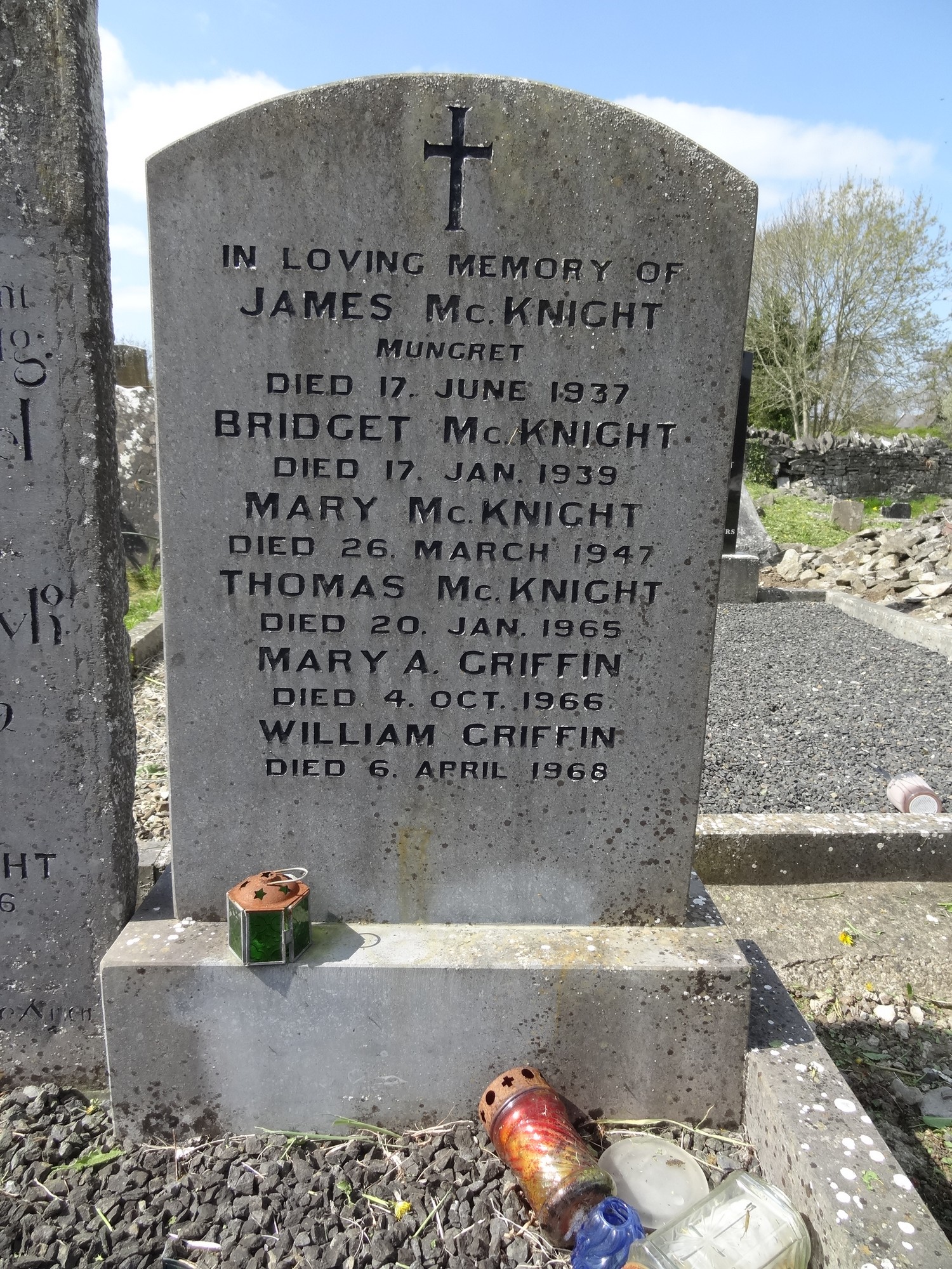In Loving Memory OfJAMES Mc. KNIGHTMungretDied 17. June 1937BRIDGET Mc. KNIGHTDied 17 Jan. 1939MARY Mc. KNIGHTDied 26. March 1947THOMAS Mc. KNIGHTDied 20. Jan. 1965MARY A. GRIFFINDied 4. Oct. 1966WILLIAM GRIFFINDied 6. April 1968