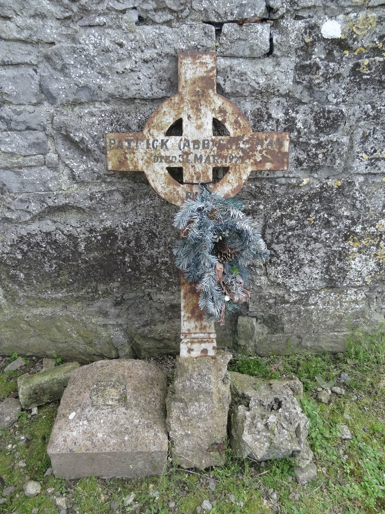 Also it is number E page 35 Added Notes in John O'Connor's 1994 survey of the graveyard headstone inscriptions. J O'Connor states metal cross leans against north wall. Its probably in same position today.