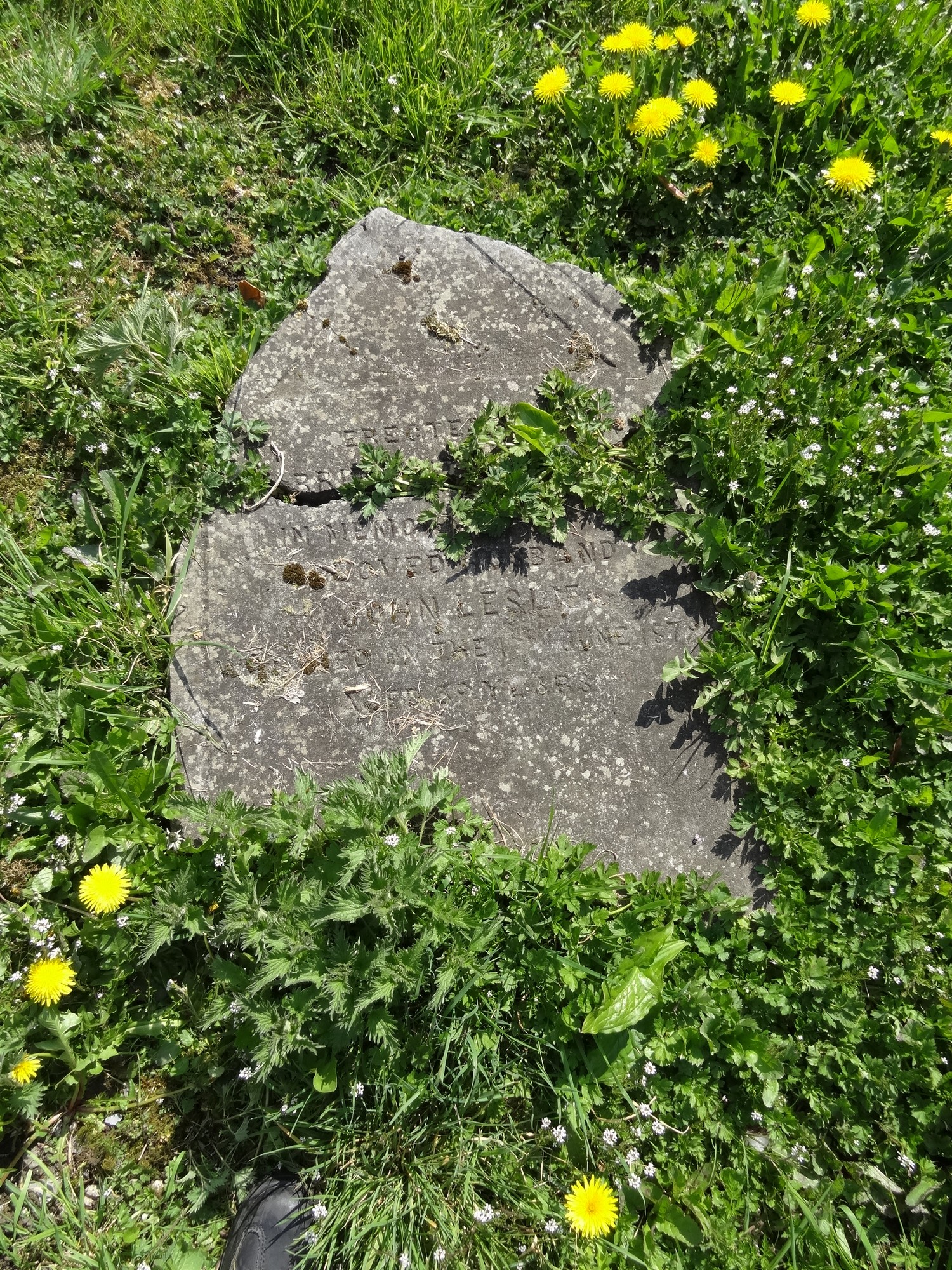 This headstone is broken and laying flat on the ground.