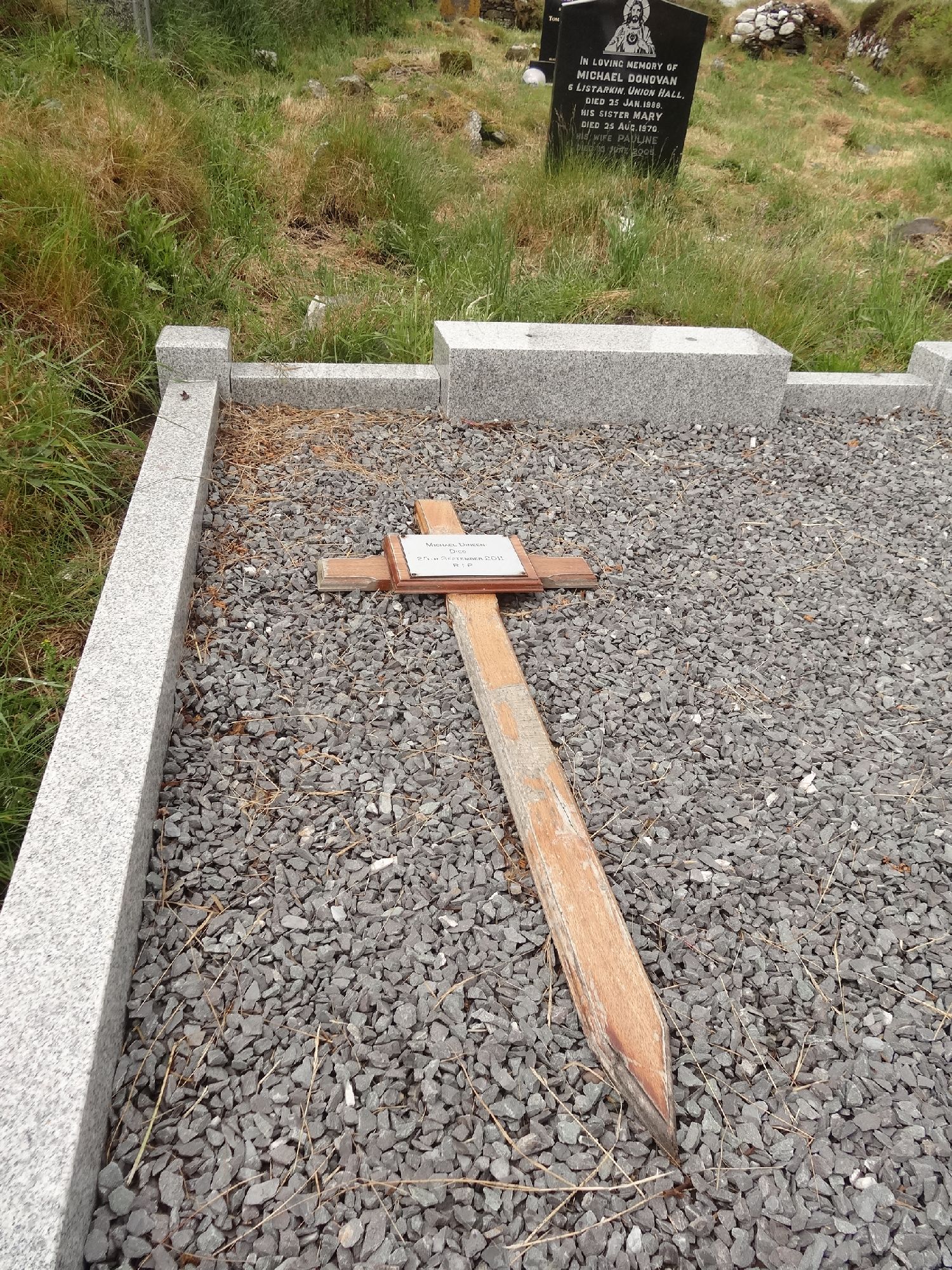Wooden cross with brass plaque within a grave surround - no headstone