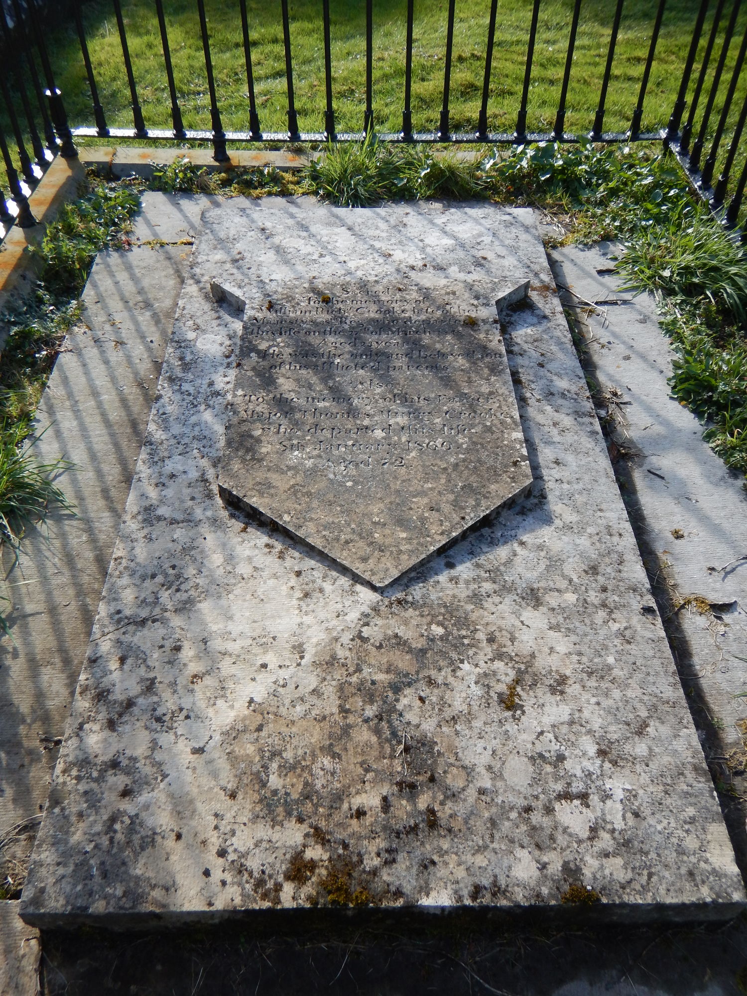 His burial place with ledged slab stone superimposed with inscribed shield- shaped stone and fully enclosed within iron railings