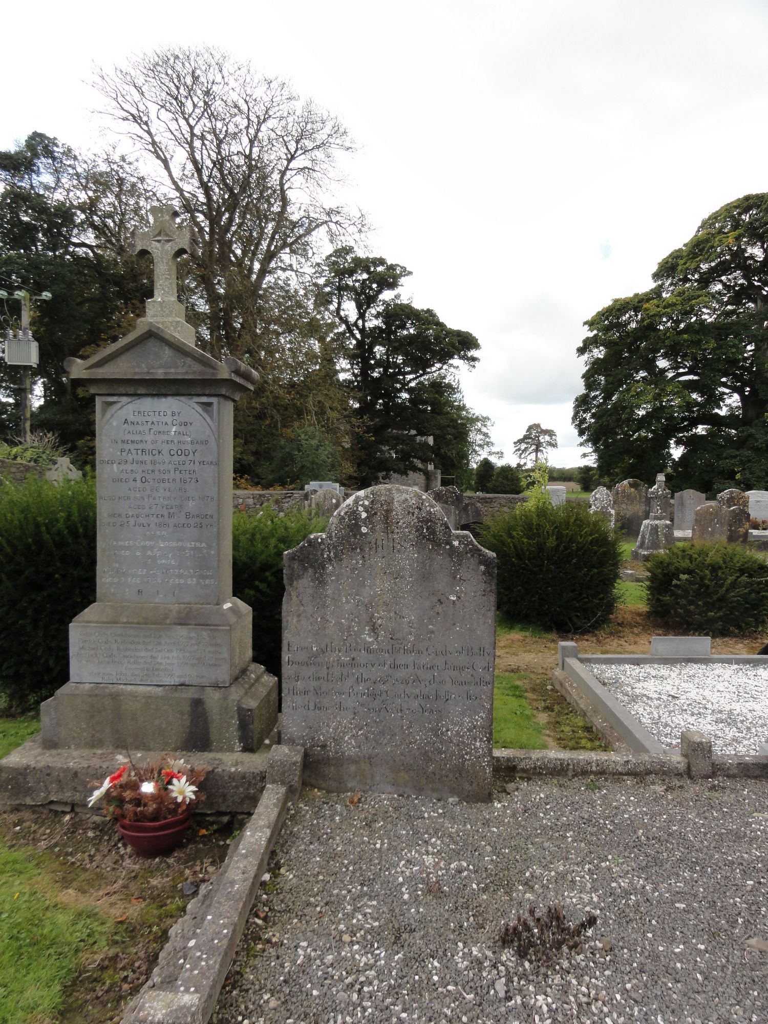 Erected by Redmond & John Cody of Ballyboden in memory of their Father James Cody who died Febry the 26th 1820 Aged 86 years. Also their Mother Bridget alias Follis who died June the 3rd 1811 aged 70 years.