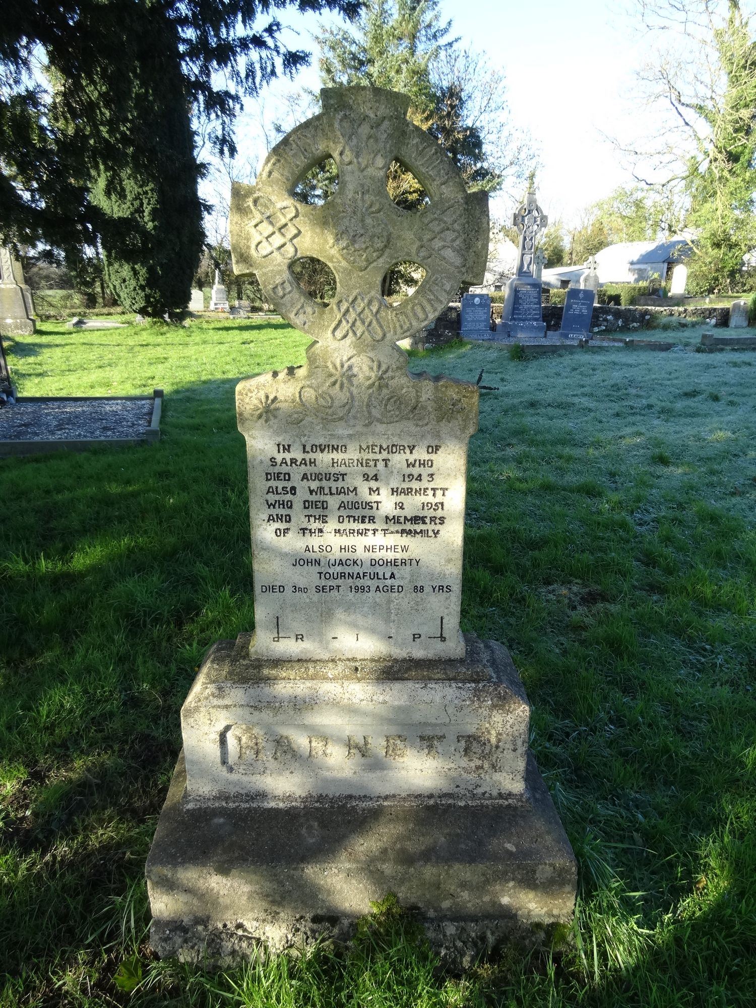 In Loving Memory OfSARAH HARNETT WhoDied August 24 1943Also WILLIAM M. HARNETTWho Died August 12 1951And The Other MembersOf The HARNETT FAMILYAlso His NephewJOHN (JACK) DOHERTYTournafullaDied 3RD Sept 1993 Aged 88 Yrs