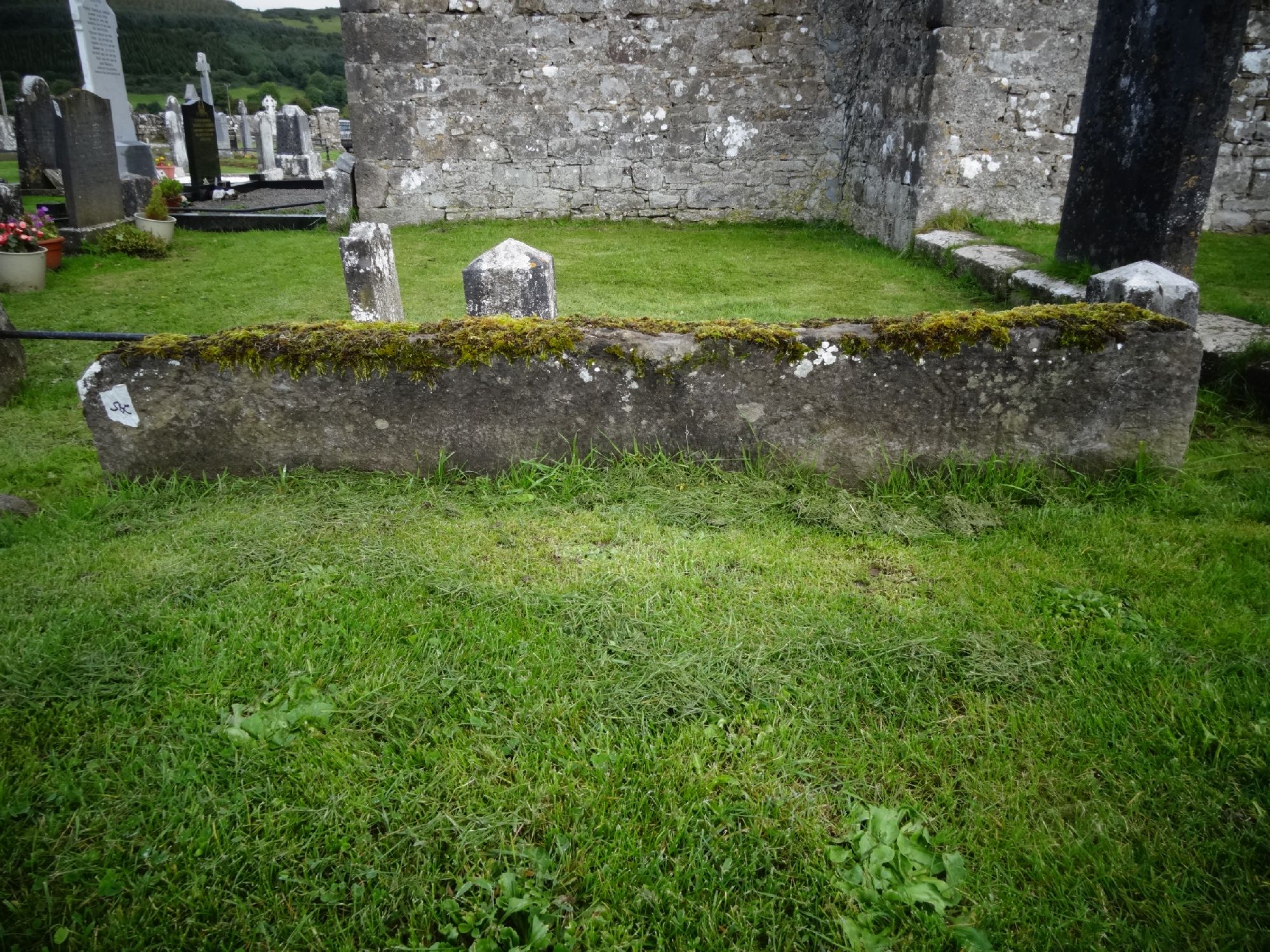 Uninscribed and illegible Large headstone placed on its side in line with the remains of the church wall. Repositioned from elsewhere. Any inscription will be below ground level