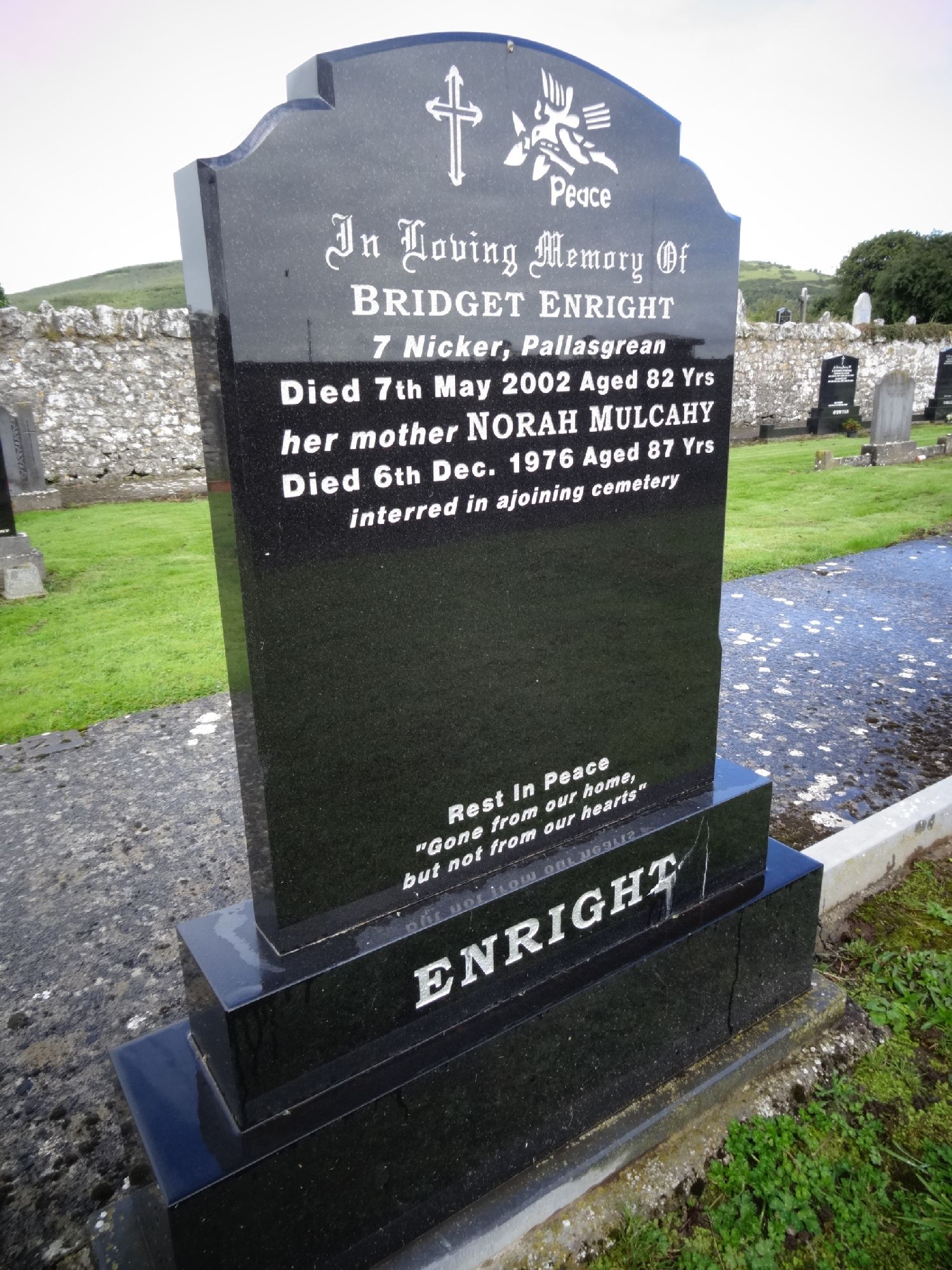 In Loving Memory Of BRIDGET ENRIGHT 7 NICKER, PALLASGREEN DIED 7TH MAY 2002 AGED 82 YRS her mother NORAH MULCAHY DIED 6TH DEC 1976 AGED 87 YRS inter4red in adjoining cemetry